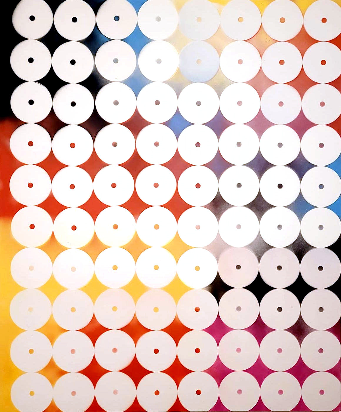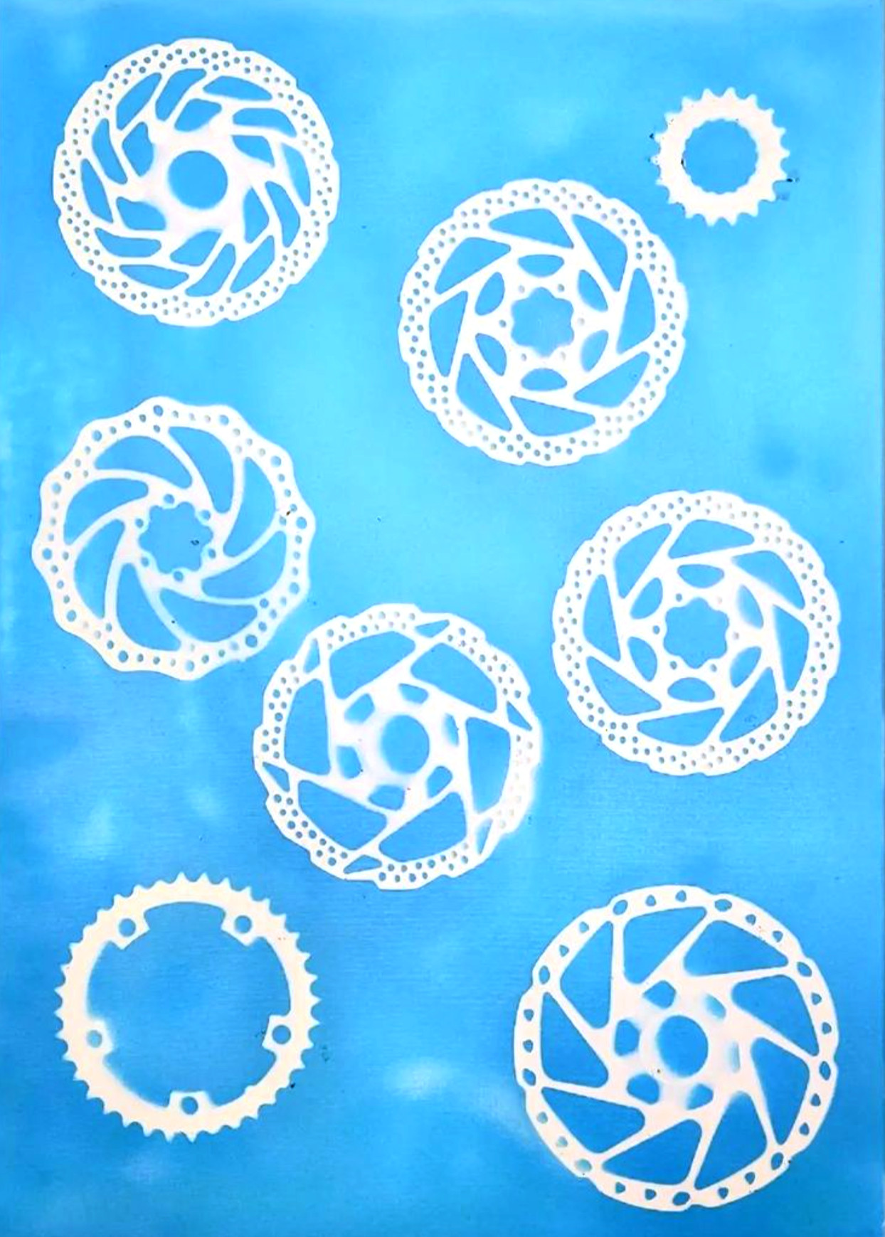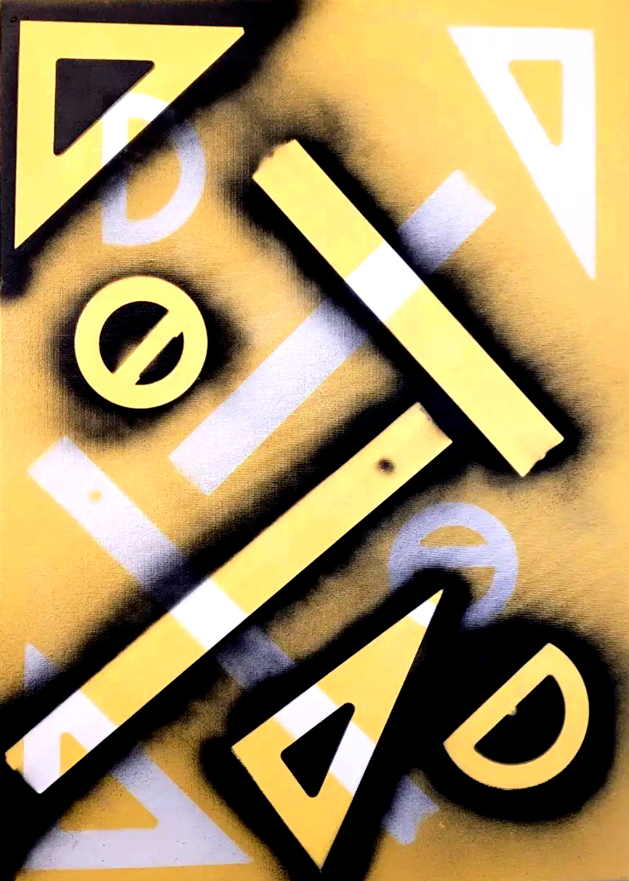 Les objets industrialisés sont rentrés dans le monde de l’art au début du XXème siècle. Le premier « ready-made » date de 1917. L’oeuvre consiste en un urinoir renversé, posé sur un socle, signé « R.Mutt », et ayant pour titre « fontaine ». Elle est traditionnellement attribuée à Marcel Duchamp (1887-1968). Cependant, sa parenté est aujourd’hui remise en question. Il se pourrait que ce soit une femme, l’artiste dadaïste Elsa von Freytag-Loringhoven (1874-1927), surnommée « la Baronne », qui ait créée cette pièce iconoclaste…Reprenant le concept de ready-made, la série « la vie ordinaire » exposée pour le festival Anti-brouillard joue avec les objets du quotidien. Cure-dents, CD-roms, engrenages de vélos, ficelles, tous ces objets fabriqués de manière industrielle ont des propriétés formelles.Dans ces peintures à la bombe, ils sont utilisés comme pochoirs pour créer des compositions colorées et géométriques qui interpellent le regardeur. Que voit-on ? Des objets ou une absence? Des répétitions ou des différences ? Une surface ou de la profondeur? Les réponses sont à inventer, car selon Duchamp : « C’est le regardeur qui fait le tableau ». Ou encore, selon la Baronne dadaïste : « Every artist is crazy with respect to ordinary life. », c’est-à-dire : « Chaque artiste est fou de la vie ordinaire. ».