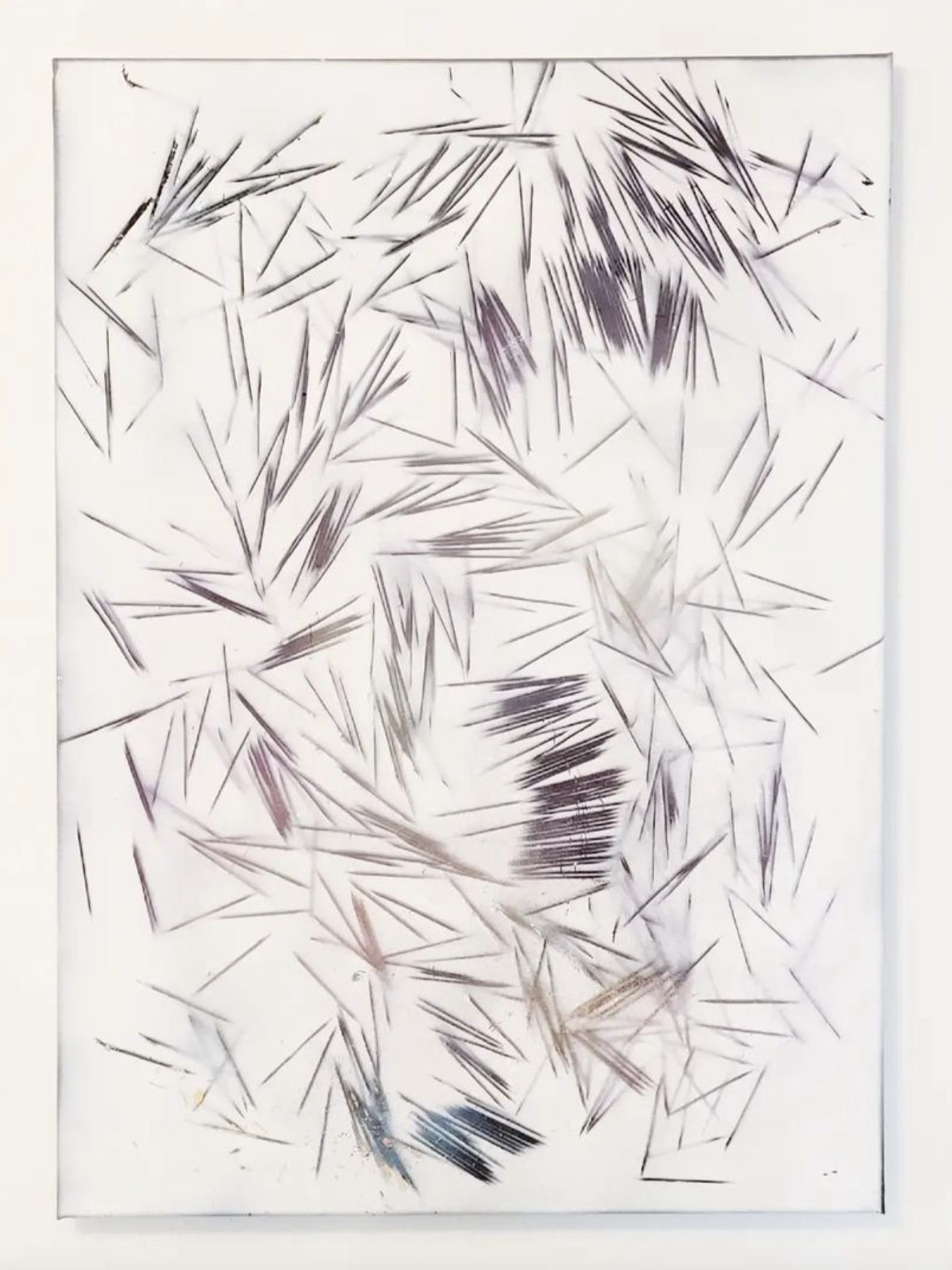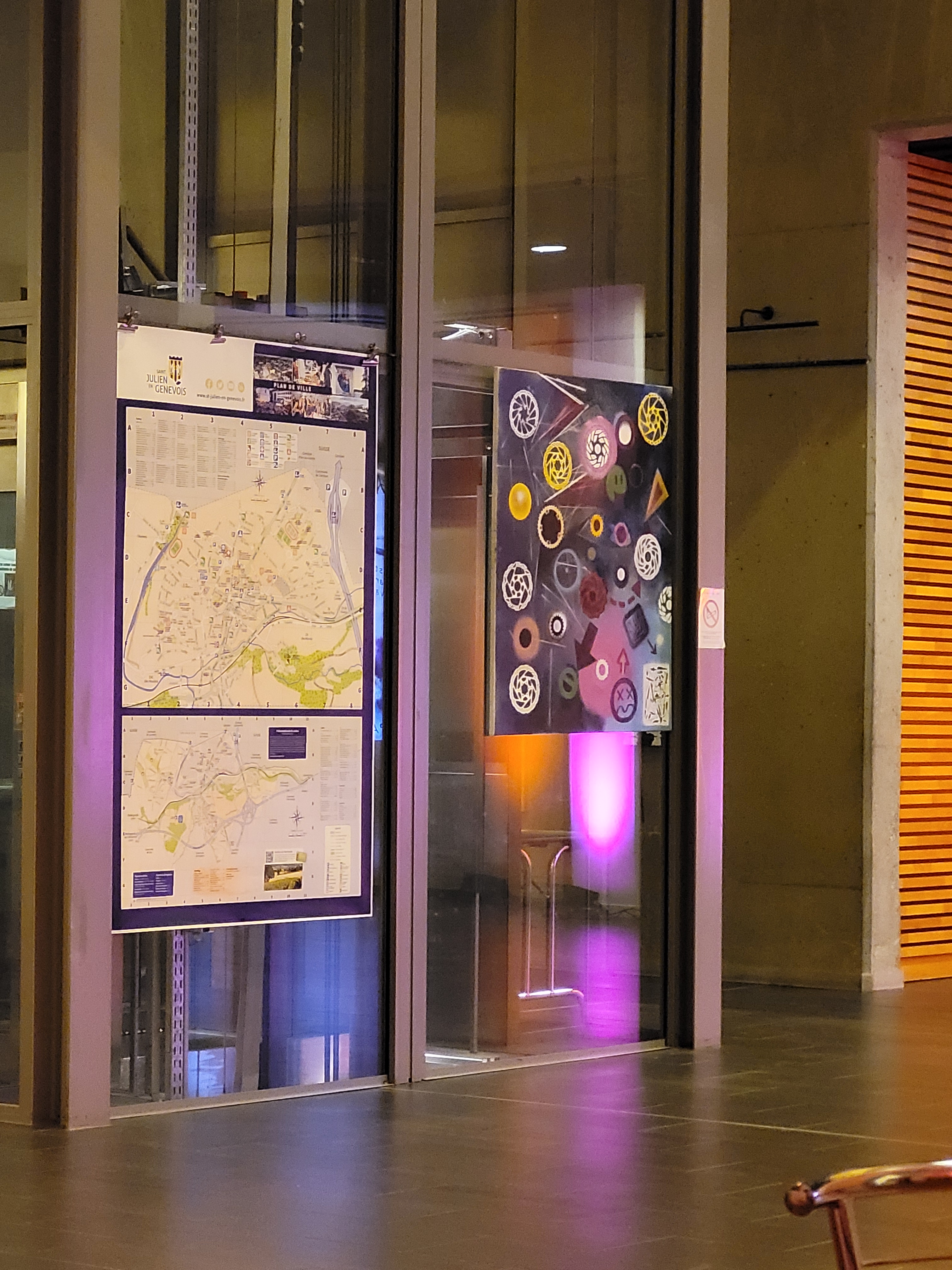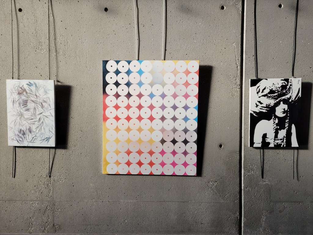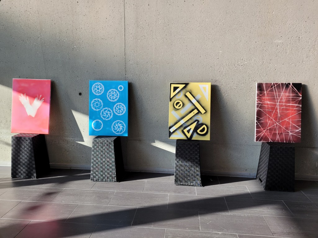 Les objets industrialisés sont rentrés dans le monde de l’art au début du XXème siècle. Le premier « ready-made » date de 1917. L’oeuvre consiste en un urinoir renversé, posé sur un socle, signé « R.Mutt », et ayant pour titre « fontaine ». Elle est traditionnellement attribuée à Marcel Duchamp (1887-1968). Cependant, sa parenté est aujourd’hui remise en question. Il se pourrait que ce soit une femme, l’artiste dadaïste Elsa von Freytag-Loringhoven (1874-1927), surnommée « la Baronne », qui ait créée cette pièce iconoclaste…Reprenant le concept de ready-made, la série « la vie ordinaire » exposée pour le festival Anti-brouillard joue avec les objets du quotidien. Cure-dents, CD-roms, engrenages de vélos, ficelles, tous ces objets fabriqués de manière industrielle ont des propriétés formelles.Dans ces peintures à la bombe, ils sont utilisés comme pochoirs pour créer des compositions colorées et géométriques qui interpellent le regardeur. Que voit-on ? Des objets ou une absence? Des répétitions ou des différences ? Une surface ou de la profondeur? Les réponses sont à inventer, car selon Duchamp : « C’est le regardeur qui fait le tableau ». Ou encore, selon la Baronne dadaïste : « Every artist is crazy with respect to ordinary life. », c’est-à-dire : « Chaque artiste est fou de la vie ordinaire. ».