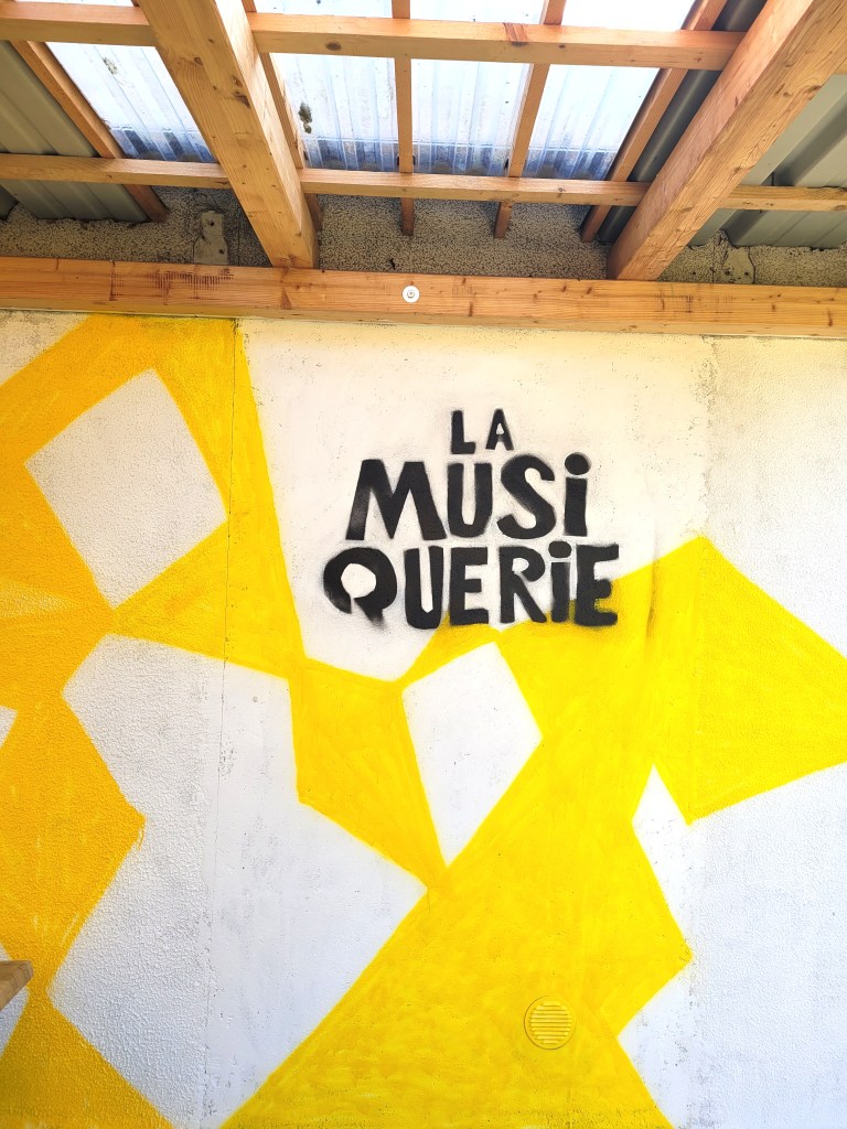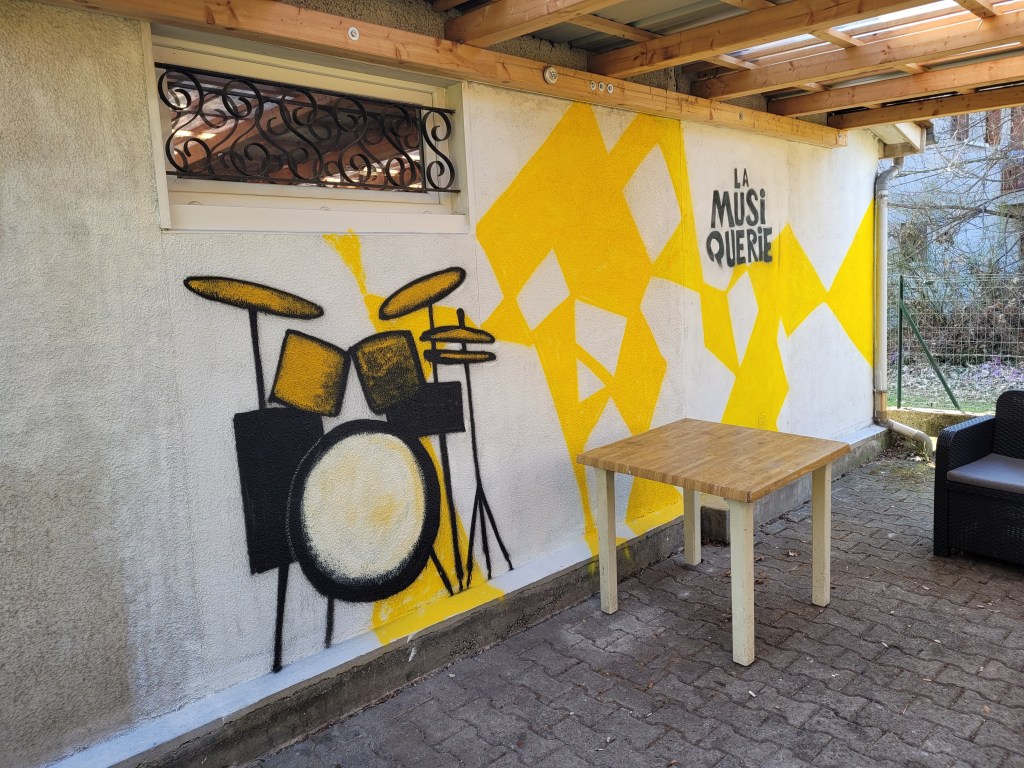 La Musiquerie est une association sans but lucratif (asbl) qui se donne pour mission de rapprocher les musiciens. Un local de répétition est disponible à Saint-Julien-en-Genevois (74160). Le graffiti musical que j’ai réalisé entre 2019 et 2022 se déploie sur l’avant et l’arrière du bâtiment. J’y fais appel aux notions de perspective, et d’abstraction.