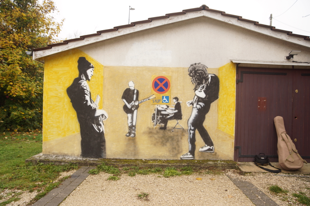 La perspective du premier mur est créée par les différentes échelles des joueurs d’instruments – basse, guitare, batterie. Le groupe représenté, Black Mondeuse, est un « héros local » de la scène hard-rock en Haute-Savoie. L’abstraction du mur arrière est une variation autour du thème de la synesthésie. Une perception peut mêler sons et lumières, et c’est aussi le but de ce graffiti. Le noir, le blanc et le jaune sont invoqués pour créer personnages, perspectives, triangles et batterie, ainsi que le logotype de la Musiquerie.