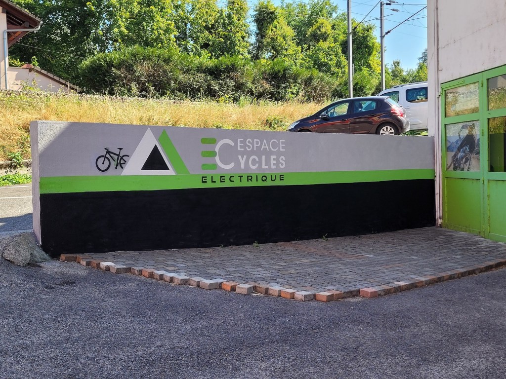Cette peinture murale a été réalisée durant l’été 2022 pour Espace Cycles Electrique, un magasin de vélos électriques situé à Saint-Julien-en-Genevois, qui propose également l’entretien et la réparation des vélos.